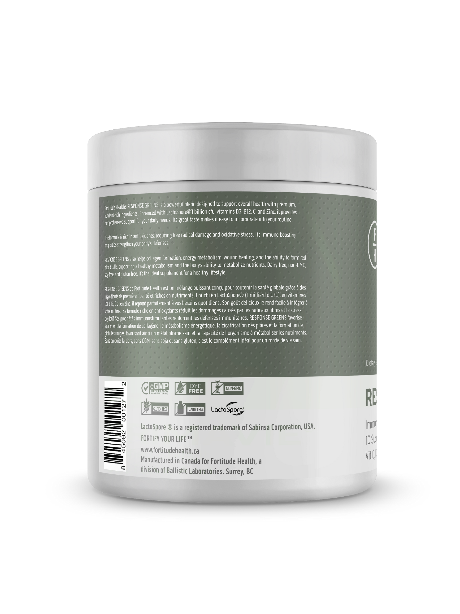 Response Greens is a nutrient-rich greens powder formulated to support immune health, digestion, and daily vitality. Each scoop combines whole-food ingredients, antioxidant-packed berries, and essential vitamins including Vitamin C, Vitamin D, and Zinc to strengthen your body’s natural defences. With Spirulina, B12, and Red Beet for sustained energy and focus, and the probiotic Bacillus coagulans to promote gut balance and nutrient absorption, it’s a complete approach to everyday wellness. Gluten-free and made without artificial colours, flavours, or sweeteners, Response Greens provides clean, convenient nutrition to help you feel your best year-round.